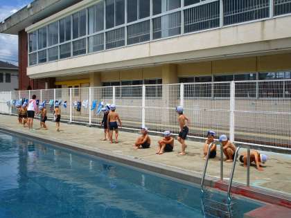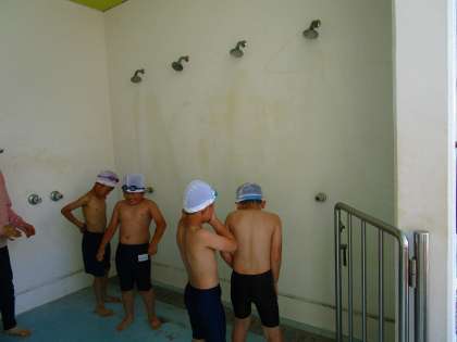1年生は初めて長堀小学校のプールを利用します。今日は「着替え」「マスクなしで移動」「シャワーの使い方」「プールサイドの座り方・待ち方」「タオルの掛け方」など覚えることがたくさんでしたが、一生懸命先生の話を聞いて、取り組んでいました。