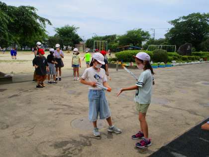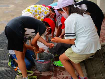 同じ時間帯に、4年生の児童が昇降口前で、やはり理科の実験中でした。