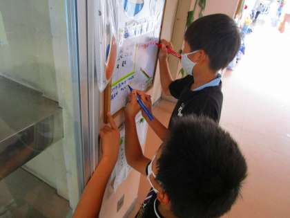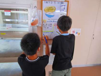 毎朝、給食委員会の児童は、各階の献立ボードに『今日の給食』を記入したりカードを貼り直したりています。