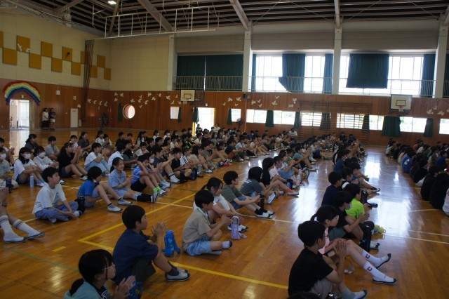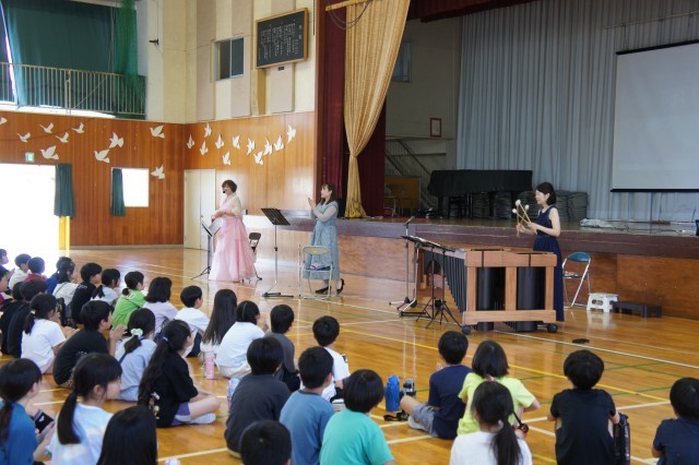 全校児童を対象に文化芸術出前授業を行いました。今回は、フルートとマリンバという組み合わせの演奏会でした。子供たちは、フルートの澄んだ音色とマリンバの温かく豊かな響きの絶妙な重なり具合いに感銘を受けていました。2年生の国語科教材「スイミー」の朗読と演奏を聴いたり、曲に合わせて手拍子をしたり、音楽の素晴らしさを改めて実感していました。日常では味わえない、心が豊かになるひと時でした。