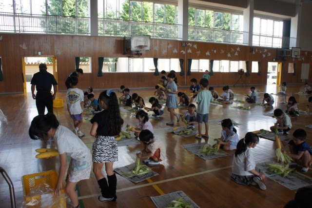 2年生では、生活科の学習「やさいをそだてよう」の一環として、とうもろこしの皮むき体験を行いました。地域の方が来校してくださり、とうもろこしの皮のむき方や、とうもろこしについてのお話をしてくださいました。子供たちは、地域の方の話をよく聞きながら、一生懸命にとうもろこしの皮をむいていました。最初は皮のかたさや、ひげの多さに戸惑う様子も見られましたが、むいていくうちに黄色く輝く粒が見えてくると、「おいしそう!」と嬉しそうな声があがりました。手でさわって、においをかいで、目で見て野菜と触れ合う貴重な体験となりました。皮をむいたとうもろこしは、給食室で蒸していただき、給食の時間においしくいただきました。自分たちで皮をむいたとうもろこしは、特別な味がしたようで一段とおいしく感じたようでした。