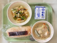 今日の給食コッペパンチョコクリーム牛乳アスパラガスのクリームシチューオニオンドレ...