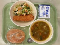 今日の給食米パン牛乳県産いわしフライ小松菜サラダカレースープ