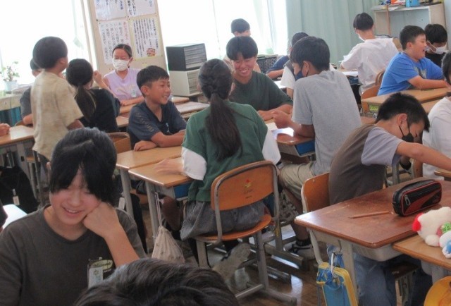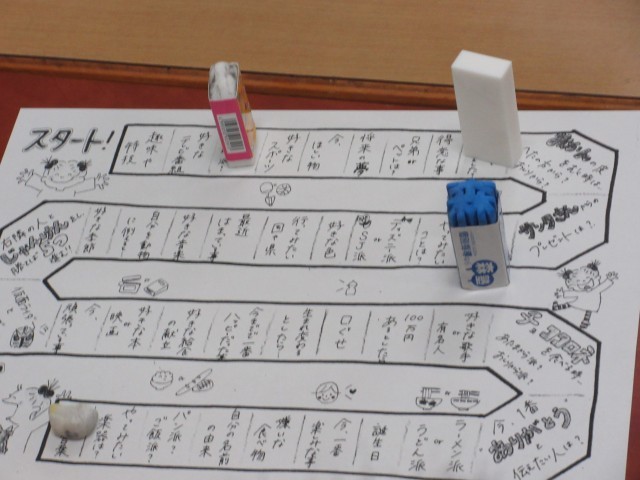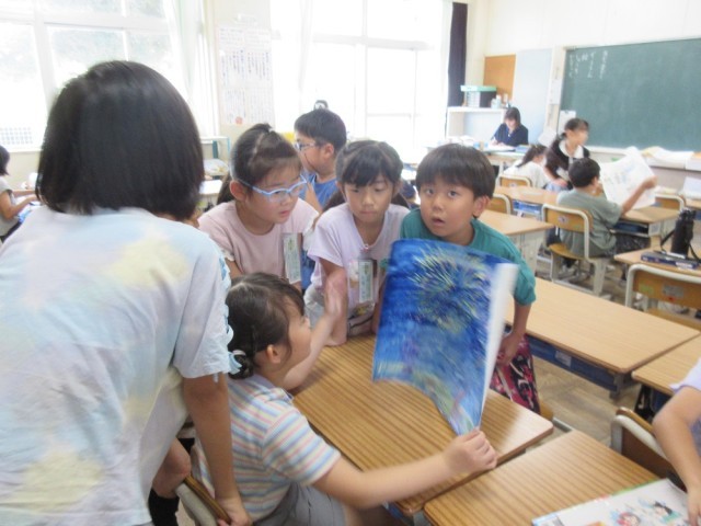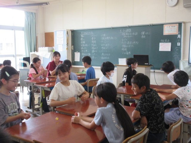 各教室をのぞいてみると、みんな楽しそうに活動していました。高学年は、サイコロトーキングやすごろくをしていました。「夏休みで一番の思い出は?」「今いちばん楽しみなことは?」などのお題にみんな笑顔で答えていました。2年生の教室では、夏休みの課題を見たり、楽しかったことを絵や文で書いていました。「上手だね」と友達のところに集まって鑑賞したり、「楽しいことがたくさんありすぎて書くのがたいへん」などと言いながらたのしかったことを思い出していました。1年生は教科書の音読です。一生懸命読めてすばらしいですね。9月からの学習にスムーズに進めそうです。