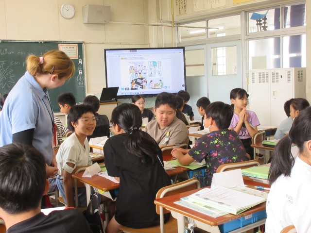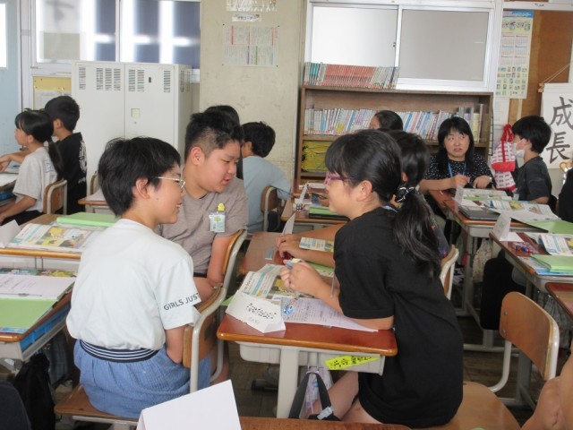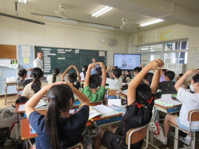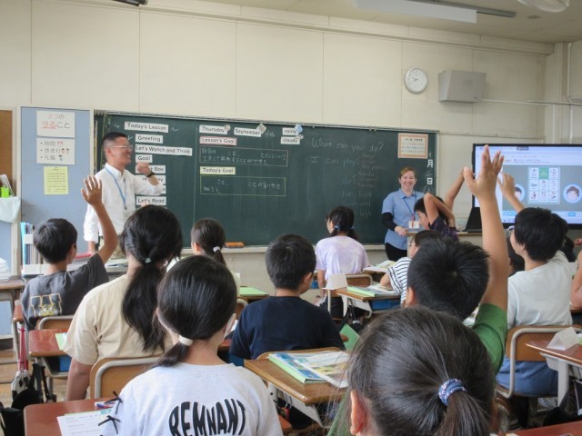 5年生の教室では、外国語の学習をしていました。AETの先生と英語専科の先生2人で授業をしています。先生たちは英語で会話をしていますが、子供たちはそれを理解しているようで「Yes!」などと反応していました。今日は「自分のできること、できないこと」を伝える学習でした。"What can you do? "対して "I can play soccor."I can do judo.”などと楽しそうに会話していました。たくさん英語を聞いて発音して、英語で自由に会話ができるようになるといいですね。