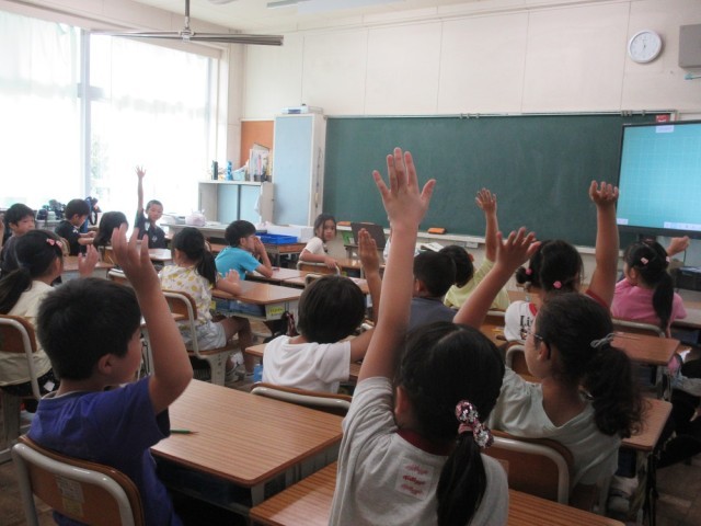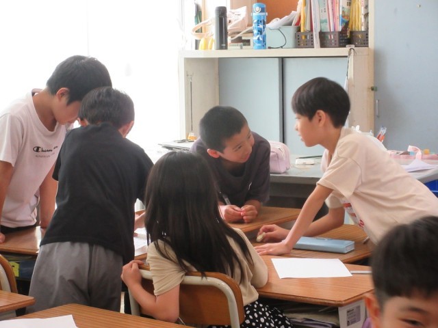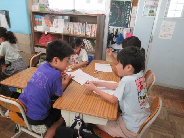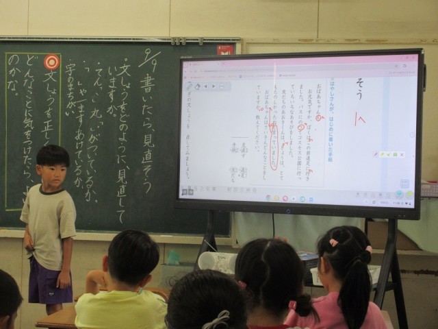2年生の教室に行くと、国語の学習をしていました。先生が書いた文章をみんなが読むと、「変な文」「『へ』なのに『え』になっています」「読み方は同じだけど、『わ』じゃなくて『は』です」など気付いたことをどんどん発表しています。これを参考にしながら、別の文もグループで見直していました。「そうか、ここは丸を書くのか」「話しているところはかっこをつけるんだよ」など話していました。見直すときには、点や丸、かぎ、文字のまちがいに気を付けるといいそうです。実際に読んで確認すると分かりやすいということも分かりました。これから、文を書くときに思い出すといいですね。