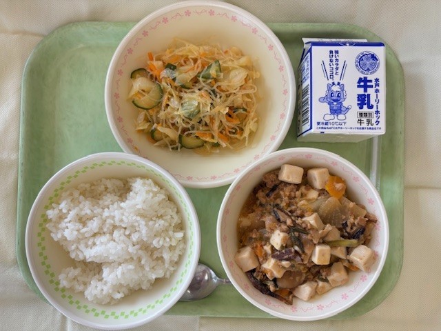 今日の給食委員会の放送は、「香辛料について知ろう」でした。香辛料の使用は、おいしく減塩するためのひとつの方法です。今日のマーボー豆腐には、豆板醤が入っていて、バンサンスーには、からしが使われています。ぜひご家庭でも香辛料をご活用ください。