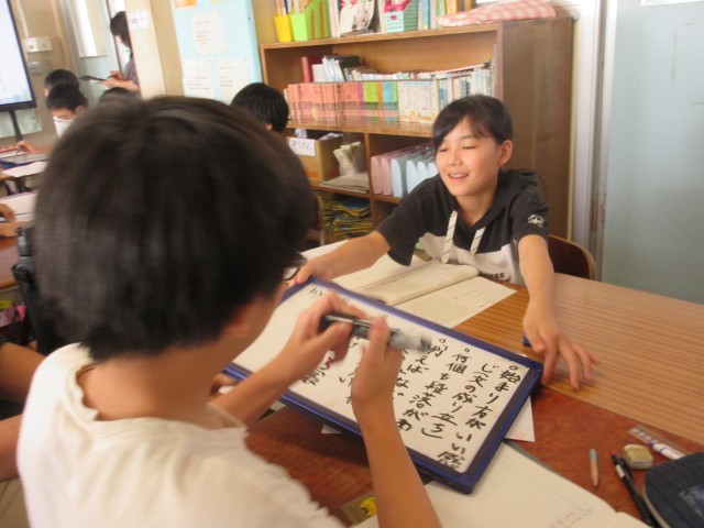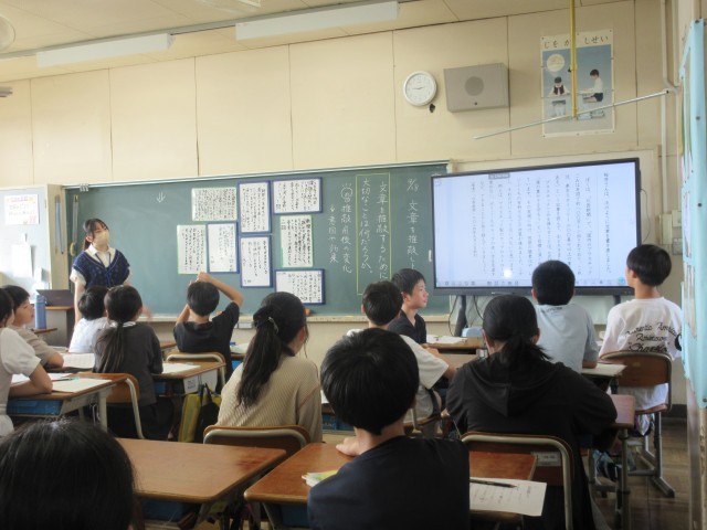 6年生の教室では、「文章を推敲しよう」という国語の学習をしていました。6年生は卒業文集をつくるので、これから役に立ちそうな学習です。推敲したあと、どんなことに気を付けるとよいかグループで考えました。さすが6年生、「もっと具体的にくわしく書くとよい」「初め・中・終わりの構成で書く分かりやすい」「新聞から引用すると説得力がある」など推敲のポイントを考えていました。