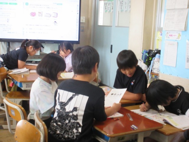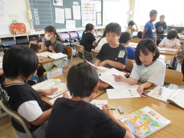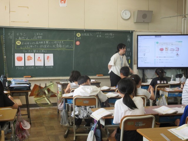 3年生の教室では算数を学習していました。「いくら持って行けばよいか見積もりましょう」という問題です。クッキーは230円だから200円に四捨五入している人や300円に切り上げる方法で見積もっている人もいます。どうするのがよいのか、グループになってみんなで考えました。「お金が足りなくなったらだめだから・・・」友達にしっかり説明している人もいました。見積もりは、普段の生活でも使うことです。これから生かしていきましょう。