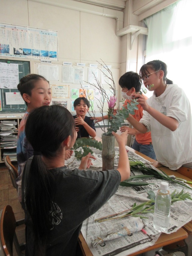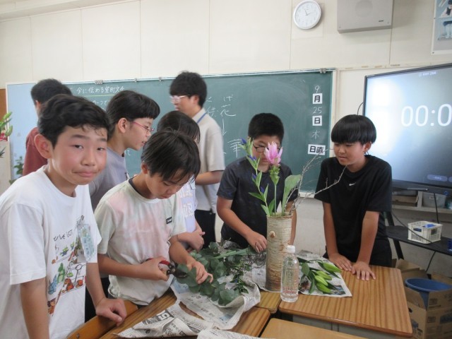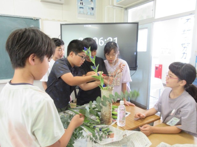 6年生の教室では社会の学習をしていました。「なぜ室町文化は、700年たった今でも多くの人に親しまれているのだろうか」というなぞを解くために、生け花の体験をしました。講師は、外野小学校の玄関のお花を生けてくださっている地域の方です。「この葉はコアラが好きなユーカリです。気分がよくなる香りがします」と教えてもらうと、さっそく匂いをかいでいました。グループで「この花を真ん中にしよう」「ユーカリはからめてみる?」「枝は左に流そう」など好きなように花をいけていました。その後、講師の先生へ質問もしていました。「日本は四季があるから、人々はその季節を楽しんでいる」「生け花をすると無心になれる」「生け花にはその人がそのまま表れる」など心に残る言葉がありました。今日のなぞは解けたでしょうか。