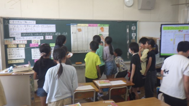 9月26日(金)に地域への授業公開が、実施されました。地域から20名の方にご来校いただき、参観していただきました。5年生では、栄養教諭が授業に入って食育の授業が行われ、バランスのよい食事について学習しました。6年生では、水溶液の実験を理科室で行い、熱することによって水溶液の性質を調べました。4年生では、ハザードマップをみながらマイ・タイムライン作りを行いました。1年生では、道徳の授業で役割演技をしながら登場人物の気持ちを考えました。その他の学級でも楽しく主体的な学習がたくさん見られました。