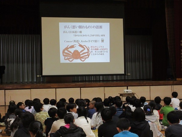 講師の先生が「がんの原因(遺伝子に傷を付けること)は何だか分かるかな」と聞くと、「食事」「放射線」とやや自信なさげな声が聞こえました。原因はいろいろありますが、「お酒の飲み過ぎ・タバコ好き嫌いのある食事・たばこ・運動不足」などは、日常生活で気を付けられることですね。それに、「100人がんに罹ったら、何人が生きていられるか」を聞かれ、「50人」と答えた人が一番多かったですが、答えは「70人」みんなからは、「えー」「そうなの」と驚きの声が上がりました。意外に治る病気なんですね。今日学んだことを覚えておきましょう。