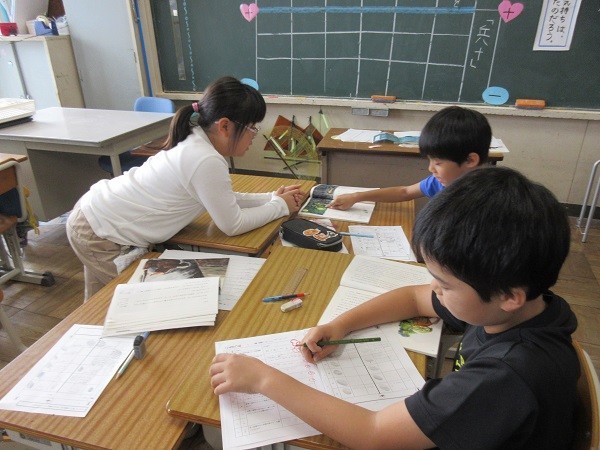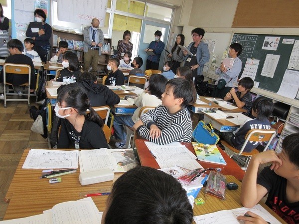 4年生の教室に行くと、国語「ごんぎつね」の学習をしていました。ワークシートに点を打っています。ごんと兵十の心の距離を表しているようです。「『ぬすっとぎつねめ』と怒っているから、兵十の心はこのへんかな」「ごんはくりやまつたけを兵十に持っていっているから、・・・」など、根拠をもとに心情を考えていました。教科書や前の時間のワークシートを見ながら、一生懸命考えたり、自分の意見を伝えたりしていました。心情曲線にしてみると、二人の心の変化がよく分かりますね。