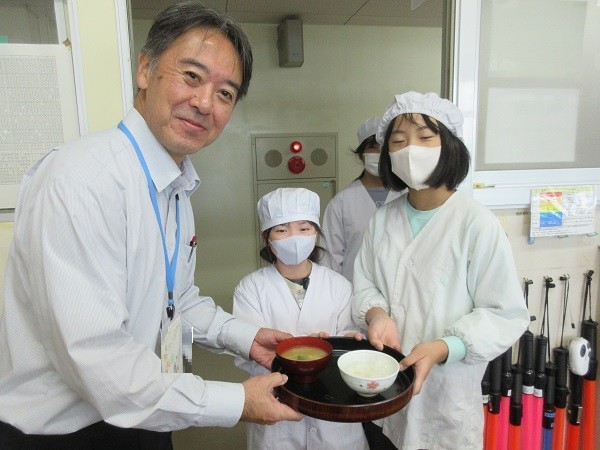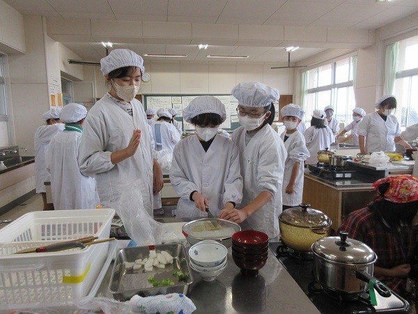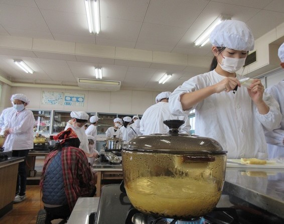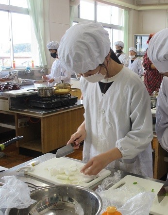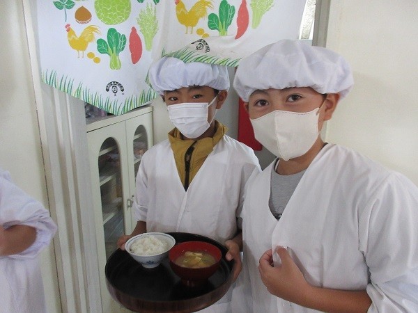 5年生は調理実習でご飯と味噌汁を作っています。ごはんはなべで炊きます。今は炊飯ジャーがあるので、ボタン一つでご飯が炊けてしまいますが、火加減を見ながら焦げないように炊いていました。「あわがぶくぶく立ってるけど、大丈夫かな」「いいにおいがしてきた」とドキドキしながらも楽しそうに作っていました。味噌汁のだしはにぼしです。大根やねぎ、油揚げも丁寧に切っていました。「大根はかたいからこわい」と言いながらも、指を切らないように指を丸めて、真剣に包丁を使っていました。だしの効いたおいしい味噌汁ができました。ぜひお家でもぜひ作ってくださいね。