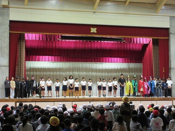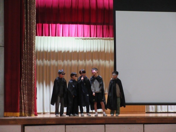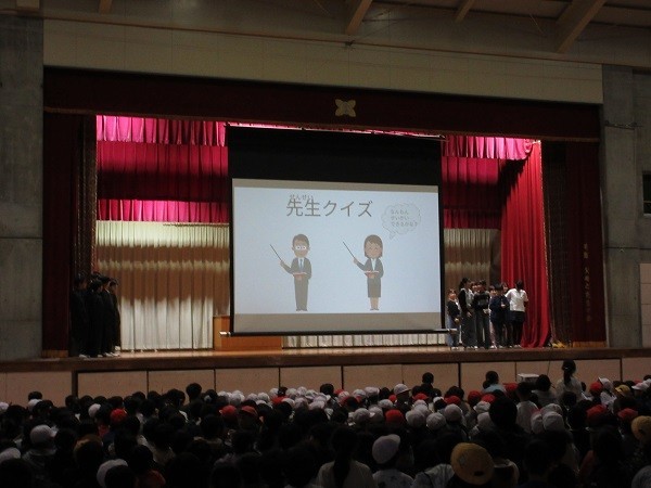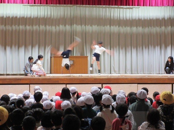 わくわく活動が終わった後、体育館に集まって集会を行いました。「先生のことをもっと知ろう集会」です。最初に、集会委員の皆さんが劇をし、新しく外野小に来た先生のクイズをしました。当たるとみんなキャーと嬉しそうでした。その後、体操をやっていた先生と児童の皆さんで体操ショーです。音楽に合わせて、みんなすごい技を見せてくれました。こちらも「すごーい」と歓声が上がっていました。これからも、先生たちのことを知って、仲良く過ごしていきましょうね。