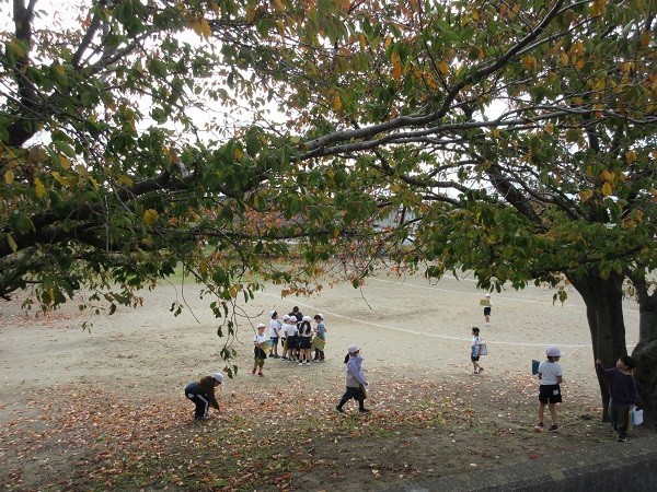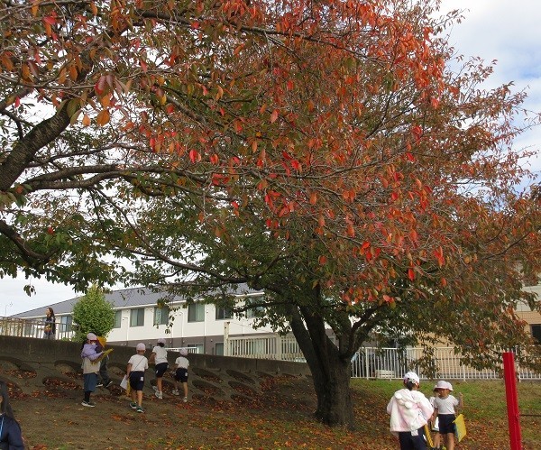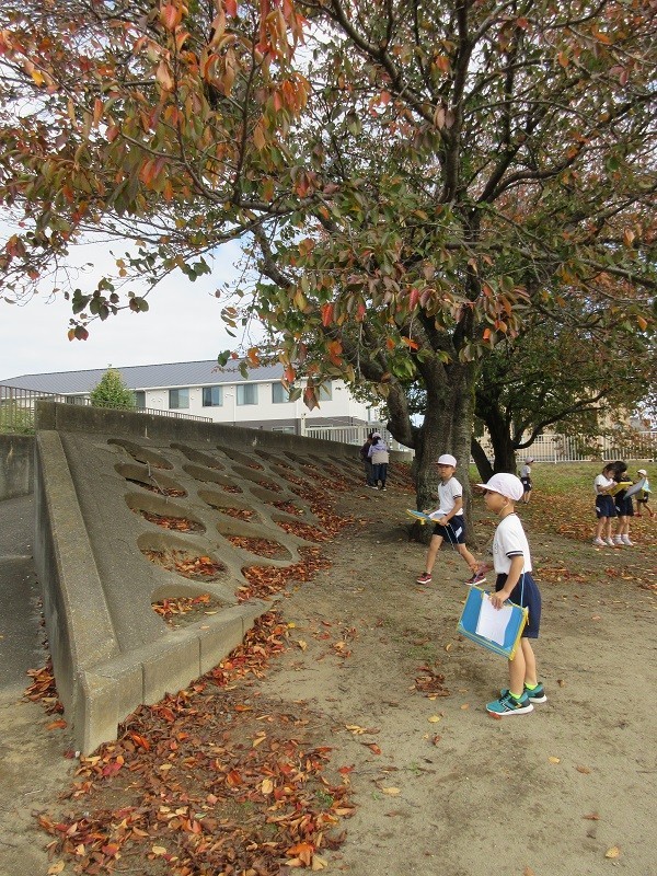 1年生は、生活科の学習をしていました。校庭で秋をさがしているようです。「見て、この葉っぱ、表が赤で、裏が黄色だよ」「向こうにどんぐりがあったよ」「風が吹くと、落ち葉も動くよ」「この草は、ふさふさしているよ」など、たくさんの秋を見つけていました。今度は、公園に行くそうです。もっとたくさんの秋を見つけられそうですね。