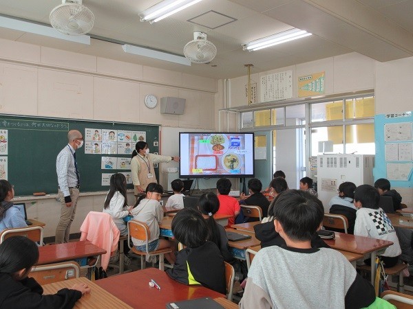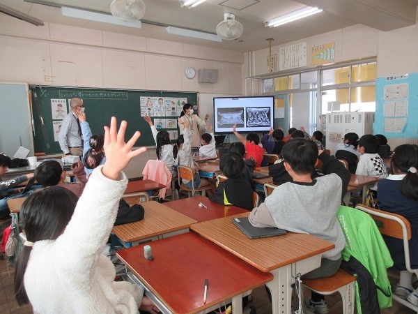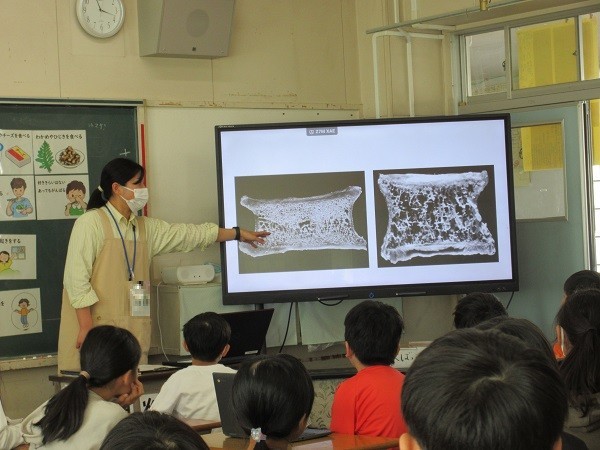 4年生の教室に行くと、食の学習をしていました。骨は体を支えたり、血液をつくったり、臓器を守ったりする働きがあります。そのためにはどうすればよいのか考えていました。栄養教諭の先生が、「給食の栄養バランスはとてもいいけれど、牛乳を飲まないと・・・」と言ってグラフを示すと、子供たちは「えー!」「バランス悪い」と反応してました。好き嫌いせずバランスよく食べることや、早寝早起きをすることも大切だそうです。小学生のうちに、バランスよく食べることで、健康な体がつくられます。これからも、何でもおいしく食べましょう。