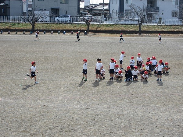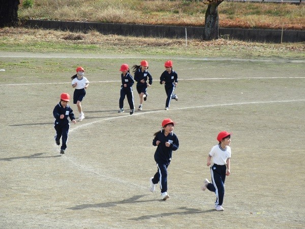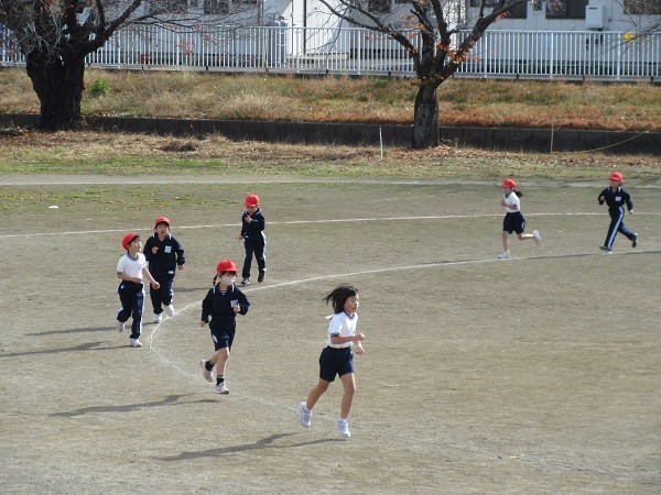 1年生は校庭で体育をしていました。インフルエンザが流行する前は「マラソンタイム」として中休みに全員で走っていましたが、今はそれはお休み中。1年生はインフルエンザの流行がやっと落ち着いてきたので持久走の練習をするそうです。みんな、一生懸命走っていました。そして、「がんばれー」「あと少しだよー」とたくさんの応援の声が聞こえました。応援されると、つらくてもがんばれますね。