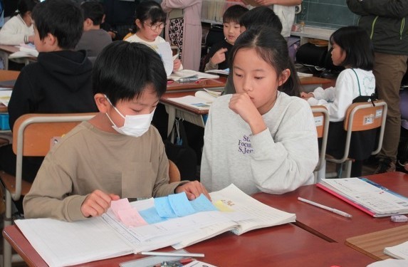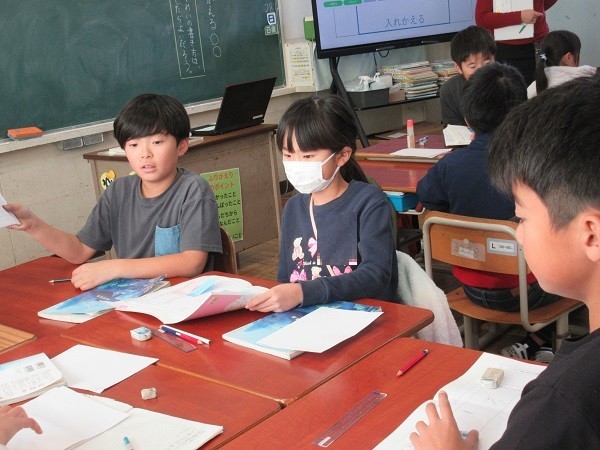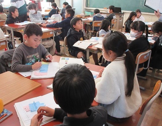 3年生の教室では、国語の学習をしていました。黒板には「すがたをかえる○○」と書いてあります。3年生は、教科書に載っている説明文「すがたをかえる大豆」を学んで、どうすれば読む人が分かりやすい文章を書けるかを学習しています。それぞれ、「すがたを変えるじゃがいも」「すがたをかえるとうもろこし」などの説明する文章を書くそうです。今日は、付箋に書いた具体例をワークシートに貼って、順番を考え、友達にアドバイスをもらっていました。今度はいよいよ書く時間ですね。