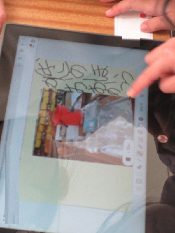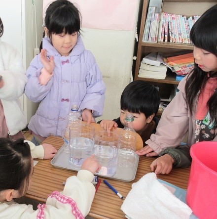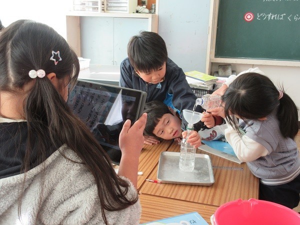 1年生の教室に行くと、算数の学習をしていました。先生が「どっちの方が多く入るかな」と形が違う2つのペットボトルを見せると、「こっちだよ。上の方が太いから」「ちがうよ、こっちだよ。長いから。」と両方の意見が出ました。「じゃあ、どうすればくらべられるかな」ということで、それぞれ、比べ方を考えました。「他のいれものに入れる」「片方のペットボトルから水をうつす」など、グループで出たやり方で実際にやってみると、「わー入りきらない」「じゃあ、こっちの方が多く入ってたんだ」、「両方同じ入れ物に入れてみたら、こっちの方が高くまで入った」など、子供たちは一生懸命に問題を解決しようとしていました。グループごとに動画や写真を撮って、見せながらみんなに説明もしていました。