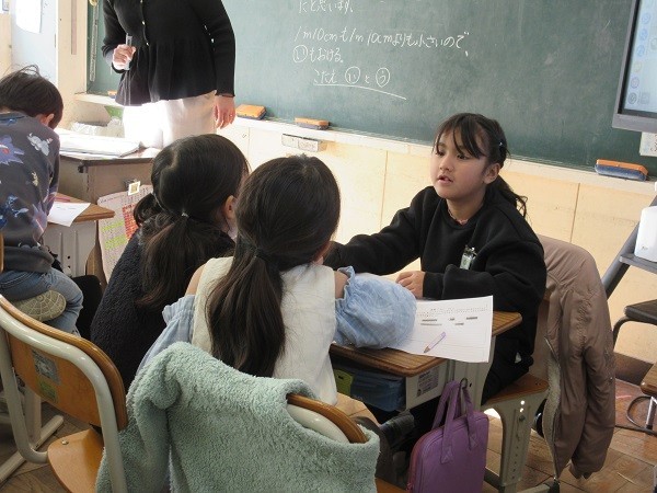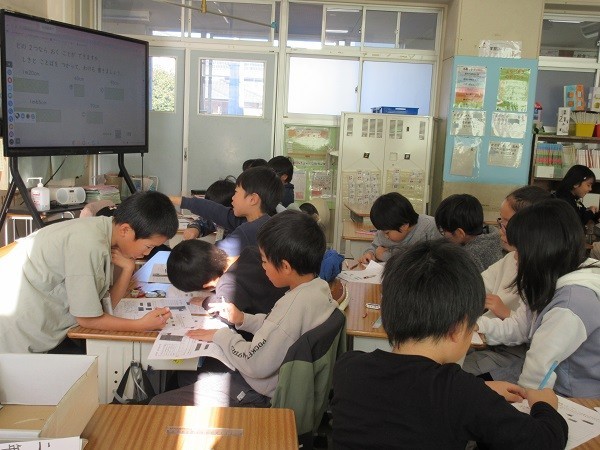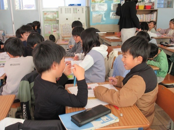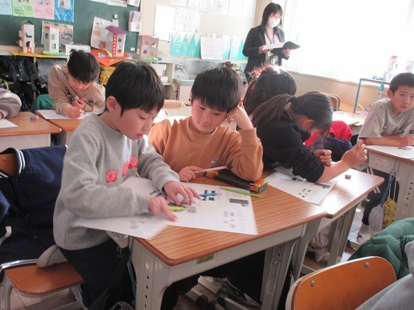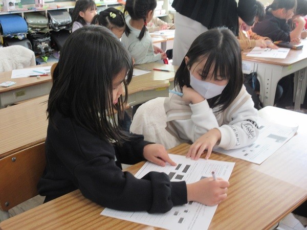 2年生の教室に行くと、算数の学習をしていました。部屋にたなを置きたいけれど、どのたななら置けるか考えています。1人で黙々と学習する子、隣の席の子と2人で考える子、4人くらいのグループで話をしながら考える子などがいて、それぞれ自分で決めて学習していました。「部屋の長さは○mだから…」「このたなは長すぎて置けないよ」など一生懸命に考えていました。自分の部屋にどんな家具を置けるのか、実際の場面でも活用できそうですね。