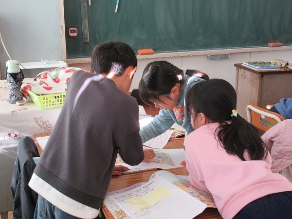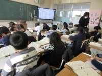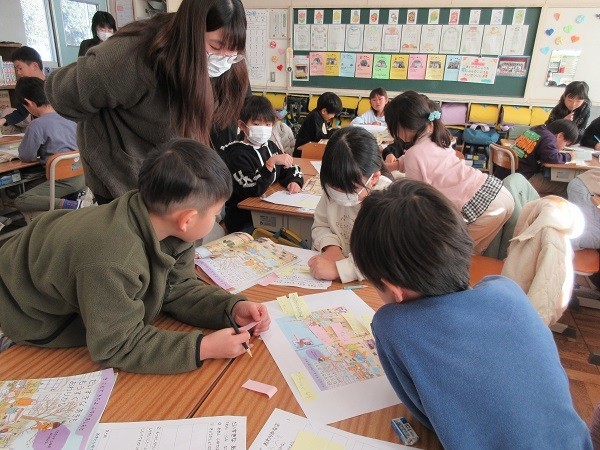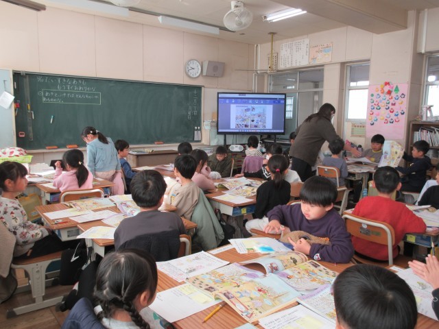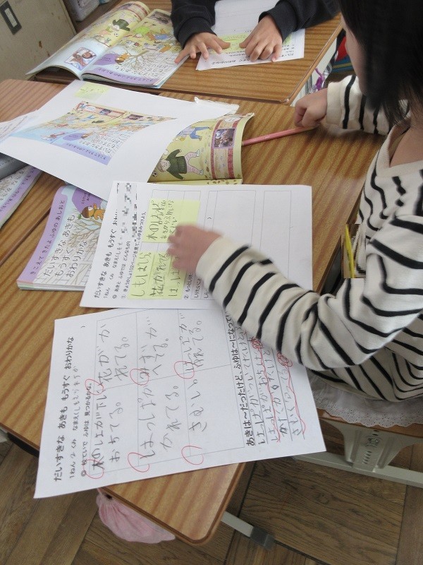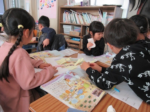 1年生は、生活科の学習で、校庭で見つけた「冬になったな」と感じたことを付箋に書いていました。先生が、「教科書の絵を見たり、自分が実際に体験したことも書いてね」と言うと、「木の葉っぱが全部落ちた」「花や虫が少なくなった」「空気が冷たくなった」「雪あそび楽しいよ」などたくさんのことを付箋に書いていました。1年生、書くのがとても速くなりました。