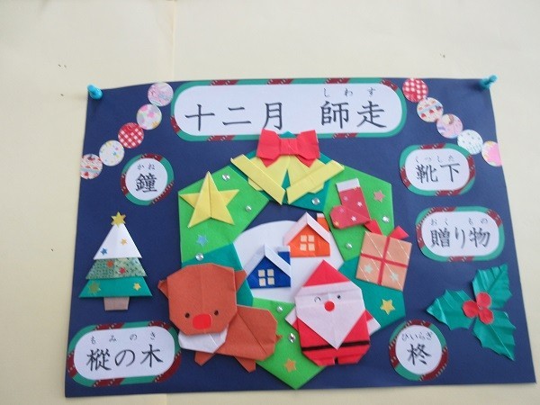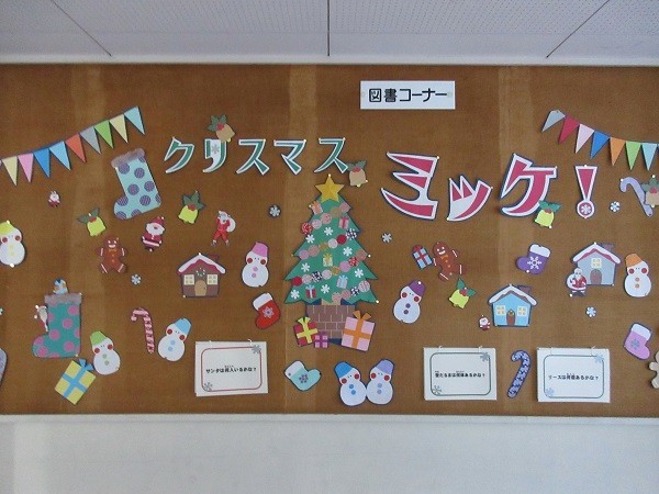 もうすぐクリスマスです。図書室に行くと、クリスマスツリーやサンタさんなどクリスマスの飾りでいっぱいでした。廊下には、みんなが大好きな「ミッケ!」のクリスマスバージョンが掲示されています。「サンタは何人いるかな」などの問題、みんな分かるかな。