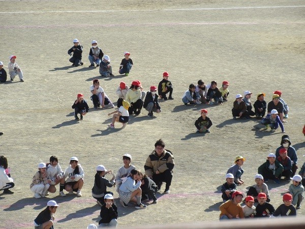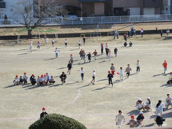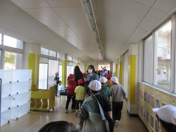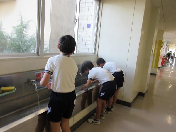 昼休みにみんなが外で元気に遊んでいると、サイレンの音とともに、「原子力災害が発生しました。外にいる児童は昇降口で衣服をはらい、決められた場所で着替えましょう。」という放送が流れました。今日は、原子力災害対応の避難訓練です。外から校舎に入ると昇降口で衣服を払い、体操服に着替えました。放射性物質を中に持ち込まないためです。手洗い、うがい、顔洗いもしました。窓もドアも閉めます。
