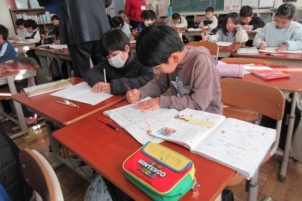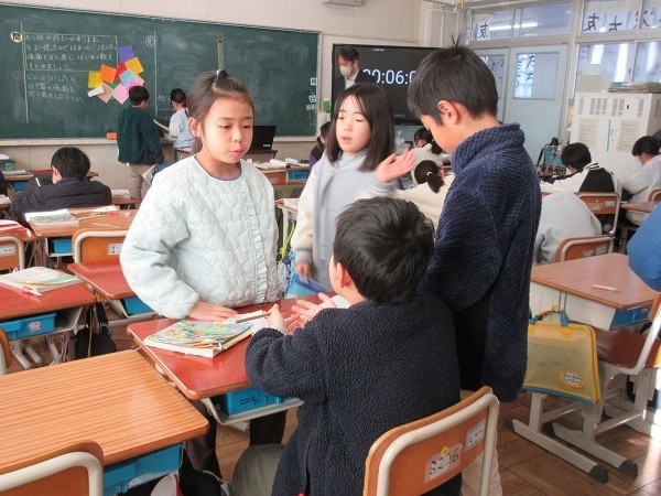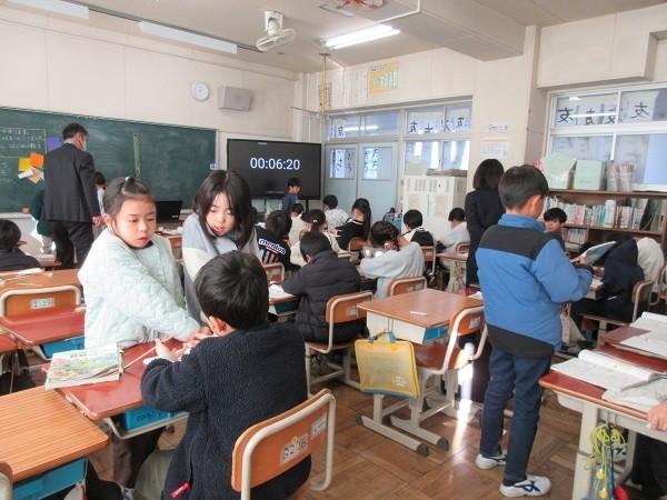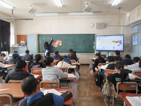 3年生の教室に行くと、算数の学習をしていました。ある場面を式に表すそうです。動画で前の時間の復習をした後、今日の場面です。「おり紙が何枚かあります。8枚使ったので、のこりが16枚になりました。」「何算になりそうですか」と先生が聞くと「ひき算」という声が。「どうして」と聞かれると、しっかり理由を言えていました。さらに「付け足しあります」と補足してくれた人もいました。