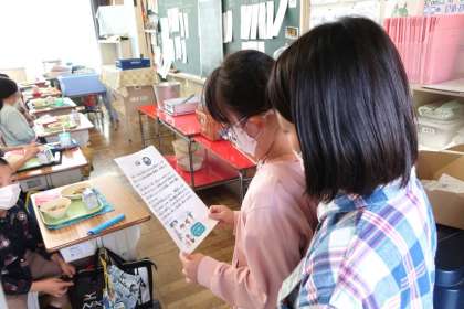 今年の十三夜は10月18日です。少し早いですが、給食では本日、十三夜献立でした。うさぎ型のハンバーグは児童だけでなく、職員も喜んでいました。昨日、「明日の給食はうさぎ型のハンバーグです。」と職員室でつぶやいたところ、今日あの有名なうさぎのキャラクターのTシャツを着用してきて、さりげなく給食を盛り上げてくれた先生もいました。ありがとうございます。十三夜は十五夜に次いで美しい月だといわれていて,昔から大切にされてきました。写真は各クラスに配付している今日の一口メモ「十三夜について」を給食係の児童が読んでいるところです。