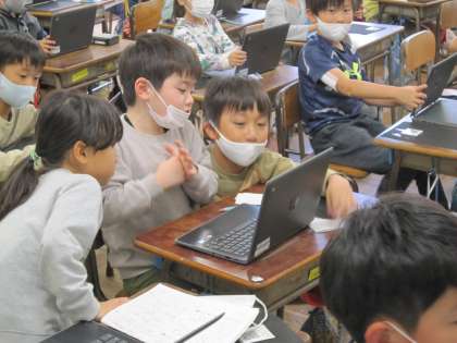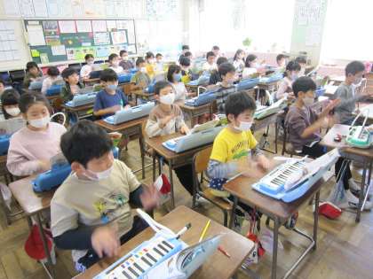 2年生の学習の様子です。机の上に鍵盤ハーモニカを置いて、演奏とリズムの練習をしました。写真は音符に合わせたリズム打ちです。1回ではできなくても、繰り返し繰り返し行うことで、できた喜びにつながっています。また、かけ算の練習をタブレットとを活用して、自分で〇段と決めて、個別に進めながら学んでいます。友達からの応援やサポートは、学び合いとしてもよい姿です。