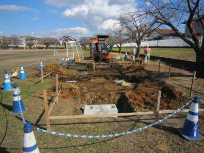 校庭の遊具の老朽化が進み、交換の時期になってきました。一つ目として、校庭の南側の中央にあったリング状の遊具を撤去し、新しい基礎を入れています。今週末に、新しい遊具が設置される予定です。