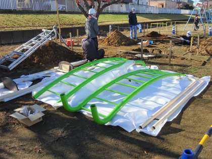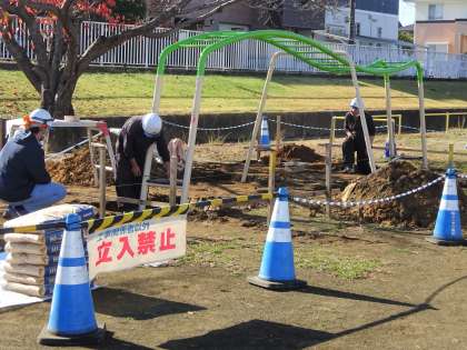 今週の火曜日から工事が始まっていた、雲梯(うんてい)が姿を見せ始めました。サッカーゴールとブランコの間に、グリーンの雲梯が設置されています。工事は今週末までかかり、検査などを経て、児童のみなさんが遊べるようになります。校庭で持久走の練習をしている子供たちや、休み時間に遊んでいる子供たちも、鮮やかなグリーンの雲梯に釘付けです。完成が待ち遠しいですね!