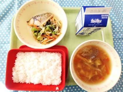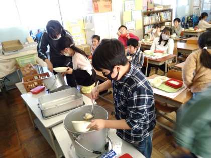 「 みぞれ 」 とは、雨と雪が混ざって降る気象現象です。お料理で「みぞれ」とは、大根やかぶをおろして入れた煮た料理のことを言います。だしが合わさって半透明になった姿が、みぞれ雪ににていることから名付けられました。今日は3年1組を訪問し、「みぞれ汁」にちなんだ3択クイズを行いました。3年生にはちょっと難しかったですが、料理の名前の由来が気象現象であるということを知って「なるほど〜」と驚いていました。写真はおかわりをしている様子です。ほとんど残りがないのにもかかわらず、食缶を傾けて具をかき集め、おかわりを確保していました。