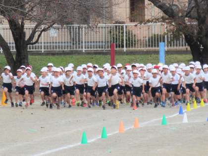 今日は、冷たい風が吹く雲の多い午前中に、校内持久走大会(1〜3年の部)が実施されました。ほとんどの子が半袖・半ズボン。寒さに負けず走り抜く姿は感動の一言です。なかには、スタートで転び、すり傷を負いながら走り抜き、ゴールをした後、お母さんの顔を見て泣き出した子もいました。