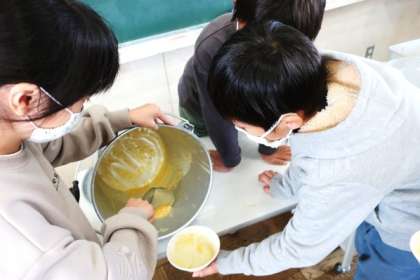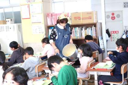 今日は3年2組を訪問しました。午前中は持久走大会だったので、楽しかった!と興奮冷めやらずの児童もいれば、疲れた顔をしている児童、おなかがすいて力が出ない〜と訴える児童と様々でした。担任の先生が1人1人に声をかけ、食事の様子を確認しながらおかわりを配っていました。さらにおかわりがしたい児童は、自分たちでおかわりを分け合っていました。