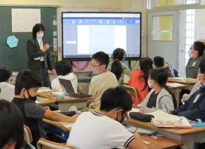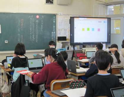 2組の国語「たずねびと」の学習の様子です。1〜4の気持ちの変化の部分を中心に、気持ちの変化をタブレットを活用してそれぞれ入力しています。また、4組では、算数「多角形と円についてしらべよう」の問題をもとに、ノートに図を書く作業と、できた図をタブレットで撮影して大型モニターで共有する学習を通して、考えを確認していました。