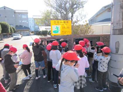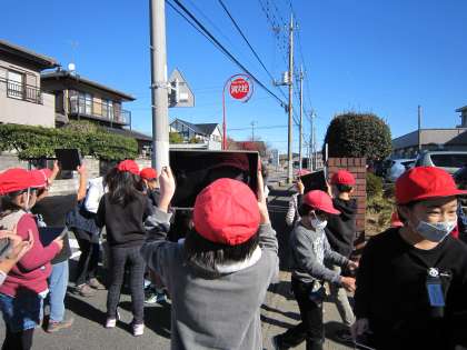 3年生の社会科の各週で、火事から守るための仕組みを学んでいます。学校にある「ひなん場所」のマークや、学校の校門付近にある「消火栓」のマークなどを確認しました。合わせて、タブレットで撮影し、まとめの資料として活用するようです。タブレットも、当たり前に活用する姿がたくさん見られました。