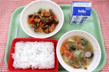 今日の「根菜チキン」は鶏肉、さつまいもを揚げ、甘辛く煮たごぼう、にんじんとからめ、白ごまと枝豆をちらしたカラフルかつボリュームがあった一品でした。どの食材も大きめにカットされていて噛み応えがあり、よくかまないと食べられず、咀嚼力が鍛えられたかと思います。とても健康的な食事でした。甘辛い味付けで好んで食べていた児童もいれば、ふだん食べ慣れない料理に困惑している児童もいました。配膳室に戻ってきた残量を確認すると、学年差というより、クラス差がみられました。もちろんどのクラスも無理強いはしていないのですが、新しいクラスになって半年以上たつと、日々の食事の雰囲気にも違いが表れ、残量の差として目立つようになりました。