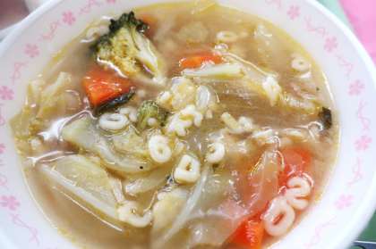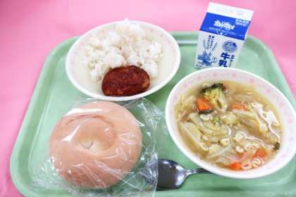 ABCスープとは、アルファベットの形をしたマカロニが入ったスープです。昨年から取り入れたところ、児童だけでなく、職員からもリクエストされるスープになりました。お昼の放送で「Aalphabet Song(ABC Song)」を流し、耳からも英語に親しんでもらえるように工夫をしました。児童だけでなく、先生たちもスープに浮いているアルファベットから自分の名前を探して楽しんでいる様子でした。