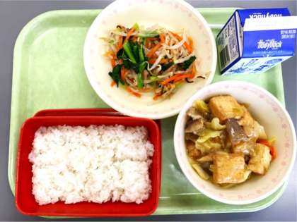 豚肉と厚揚げの味噌炒めはふんわりとした厚揚げがたっぷり入ったおかずでした。味噌味もさほど濃くなく、優しい味わいでした。スプーンはなかったですが、ご飯の上に載せて食べる児童が何人かいて、ご飯の残りがとても少なかったです。昆布和えは、昆布の味わいが野菜にしみこんだ和え物でおいしかったです。