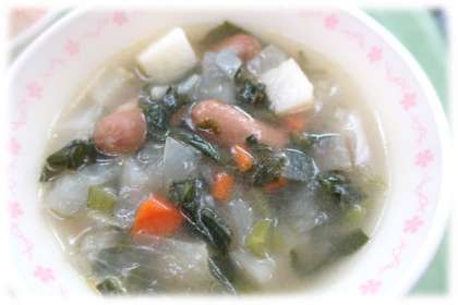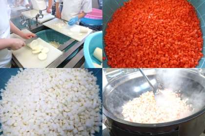 「マセドアン」はフランス語で「四角い」という意味があります。「マセドアンスープ」はサイコロのように切った野菜がたくさん入っているスープです。この野菜の切り方を、日本では「さいの目切り」と言います。ふだん野菜を切るのは一部機械を使いますが、さいの目切りは機械では切れないので、調理員が大きさをきれいにそろえながらひたすら包丁で切りました。まず、釜にオリーブオイルを入れて大根をあめ色になるくらいまでよく炒めました。それからにんじん、たまねぎ、じゃがいもと加えてじっくり炒めてからスープで煮込みました。スープに野菜のうまみがしみ出して、まろやかなスープに仕上がりました。