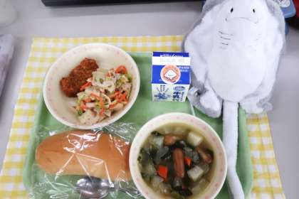 今日はひたちなか市の子どもたちに大人気の「にこちゃんフライ」でした。ひたちなか市で獲れた「アカエイ」を那珂湊漁業協同組合の女性部の方々が美味しく食べられるように加工してくれたアイデア料理です。エイのおなかがにこにこ笑っているように見えるため,「にこちゃんフライ」と名付けられました。
