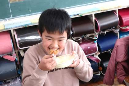 この川柳はひたちなか市で募集した「第2回とと川柳コンテスト」で大人の部で優秀賞に選ばれた作品です。この川柳を作った方は実は元外野小学校の調理員なんです!給食で子どもたちが、にこちゃんフライを笑顔で食べる姿を川柳にしたとの事でした。この川柳のとおり、子どもたちはにこちゃんフライをにこにこしながらかぶりついておいしそうに食べていました。
