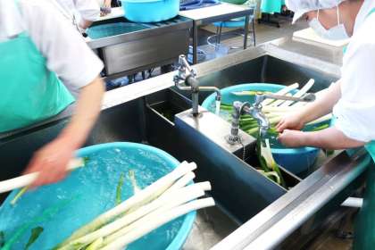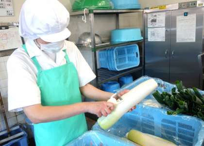 毎年、冬になると野菜の下処理が一段とツラく感じます。まず、納品された野菜自体が冷たく、まるで氷を持っているかのように感じます。そんな冷たい大根や人参を持ってひたすら皮をむくいていると、途中で手の感覚がなくなってくる事があります。さらに皮をむいた野菜を水槽で3回ていねいに洗いますが、これがまた冷たく、ツライ作業です。ですが、安全でおいしい給食を作るためには手が抜けない作業です。今日もしっかりと野菜を洗ってから切りました。