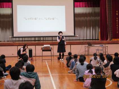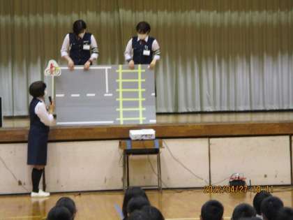 4月27日(水)、6年生が交通安全教室を行いました。6年生は、自転車の正しい乗り方について学習するのが主な目的になります。生活安全課交通安全係の方から、自転車の交通ルールや安全利用5則を説明していただきました。自転車に乗る前の点検をやらないで乗ってしまうことがあるかもしれませんが、【ブ(レーキ)・タ(イヤ)・ハ(ンドル)・シャ(たい)・ベル】は毎回きちんと点検をしなければならないと確認しました。4月29日からはゴールデンウィークが始まります。自転車に乗る機会が多くなるかもしれません。交通事故に遭わないためにも、しっかり点検をしたいですね。
