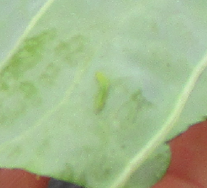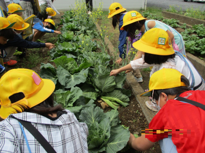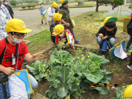 4月28日(木)、3年生の花壇にはキャベツが植えてあります。観察に行ってみると、モンシロチョウの幼虫(青虫)を見つけました。児童たちは大喜びです。まだとても小さな幼虫ですが、これからしっかり観察をしてモンシロチョウになるまでの仕組みを学習していきましょう。