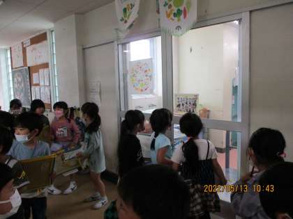 5月13日(金)、1年生が学校探検を行いました。4月7日に入学してから1か月が経ちました。学校生活にも慣れ、運動会の練習にも精一杯取り組んでいる1年生です。今日は、学級全体で移動しながら、担任の先生の説明を静かに聞き、目を輝かせながらいろいろな教室を探検できました。今まで分からなかった教室の様子が分かったかな。2回目は、グループで学校を探検するという計画もあるので、新しい発見ができると良いですね。