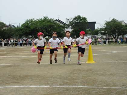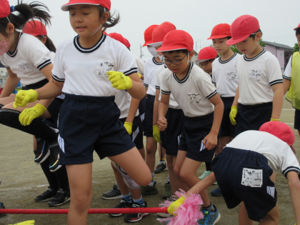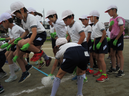 運動会最初の種目は3年生の団体種目「台風の目2022」でした。4人1組で棒を持ち、カラーコーンを2個まわって戻ってくるものです。どの組も4人で協力して棒を運ぶことができました。