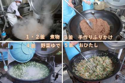 6月7日(火)外野小学校の給食室には大きな釜が5つあります。釜は汁や煮物を作るだけでなく、かつお節とちりめんじゃこをから煎りをしてふりかけを作ったり、野菜をゆでたり、ゆでた野菜をあえたりと、いろいろな調理をすることができます。家庭の調理で例えると、鍋の役割だけでなく、時にはフライパンになったり、ボウルのような器具として活用したり・・・と1日中大活躍です。
